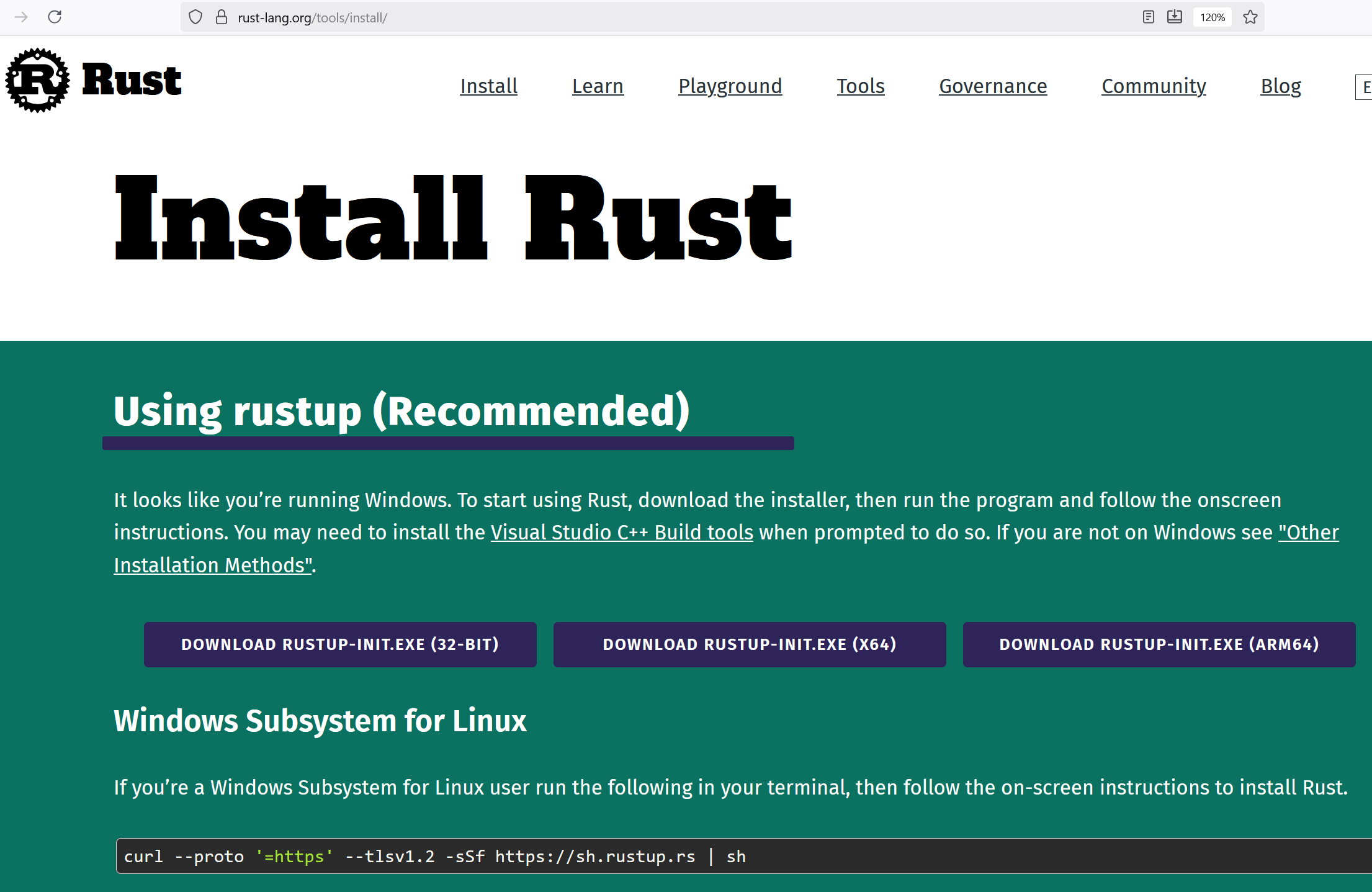 Для всех вариантов установки нам потребуется утилита rustup. Для Window, установщик rustup поставляется в виде исполняемого файла rustup-init.exe, который можно скачать с официального сайта https://rust-lang.org/tools/install/