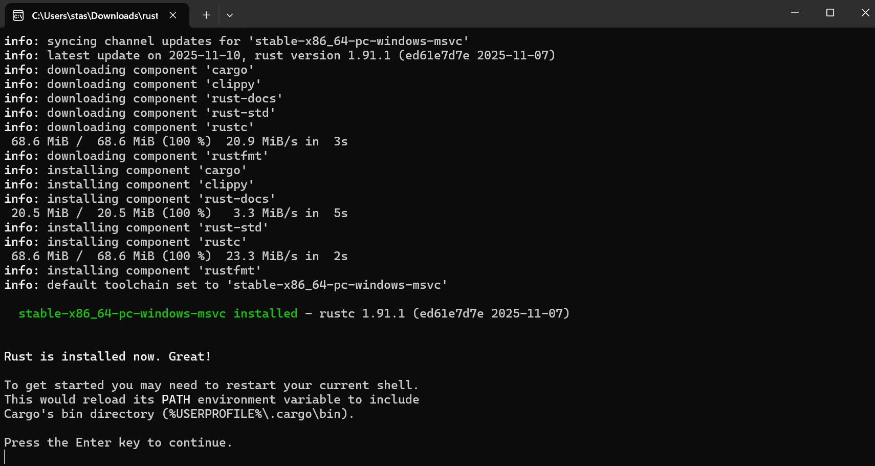 После установки компонентов Rust тулчейна, это окно консоли можно закрывать. Всё что нужно — установлено.