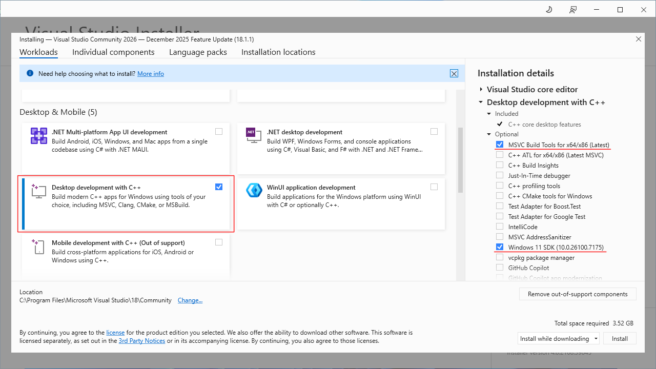 Если у вас уже установлена Visual Studio, но отсутствуют компоненты MSVC Build Tools for x64/x86 и Windows 11 SDK, то просто запустите setup.exe, который находится в C:\Program Files (x86)\Microsoft Visual Studio\Installer\setup.exe, и доустановите их.