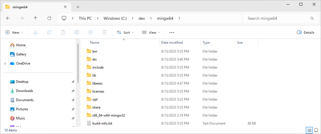 1) Скачайте 7z архив MinGW, и распакуйте в какую-то папку, например C:\dev\mingw64.