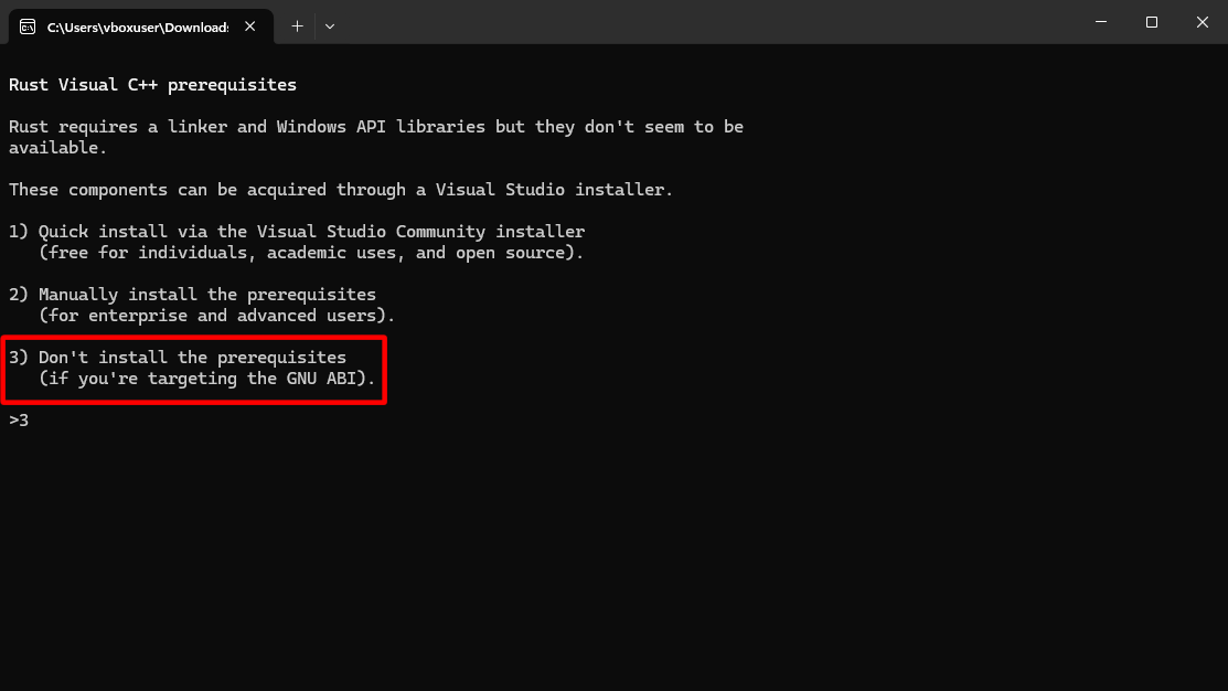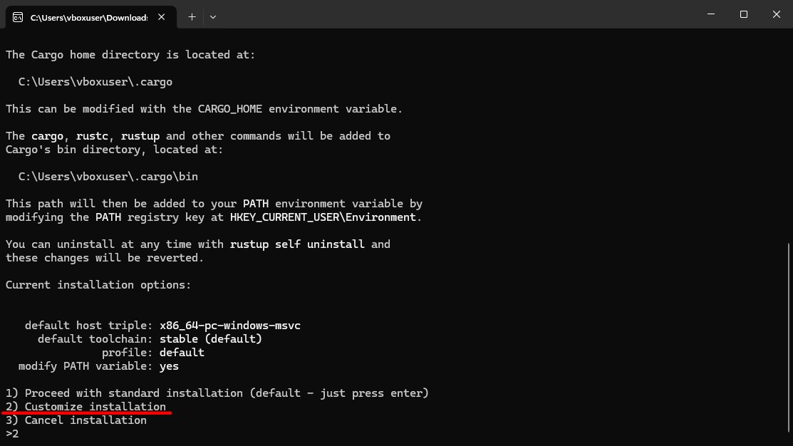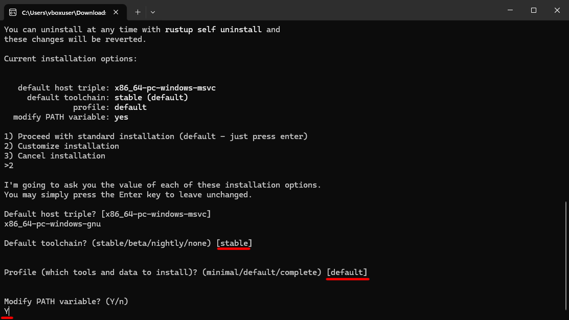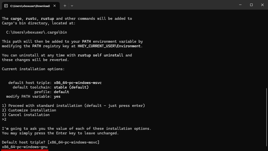 Rustup попросит указать имя Rust тулчейна, который вы хотите установить. Вместо предлагаемого по умолчанию x86_64-pc-windows-msvc, укажите x86_64-pc-windows-gnu.