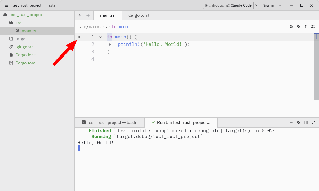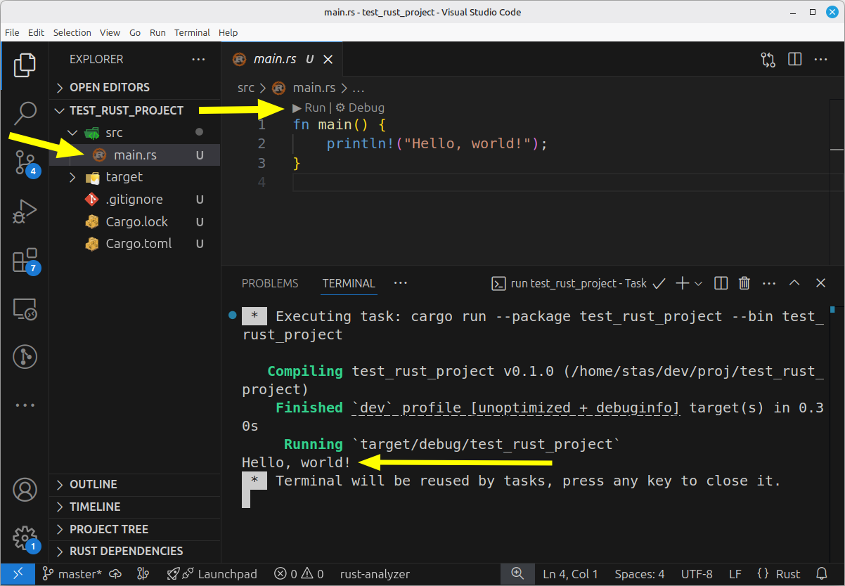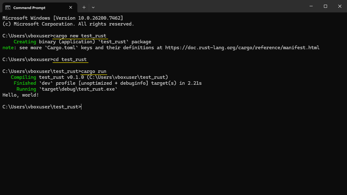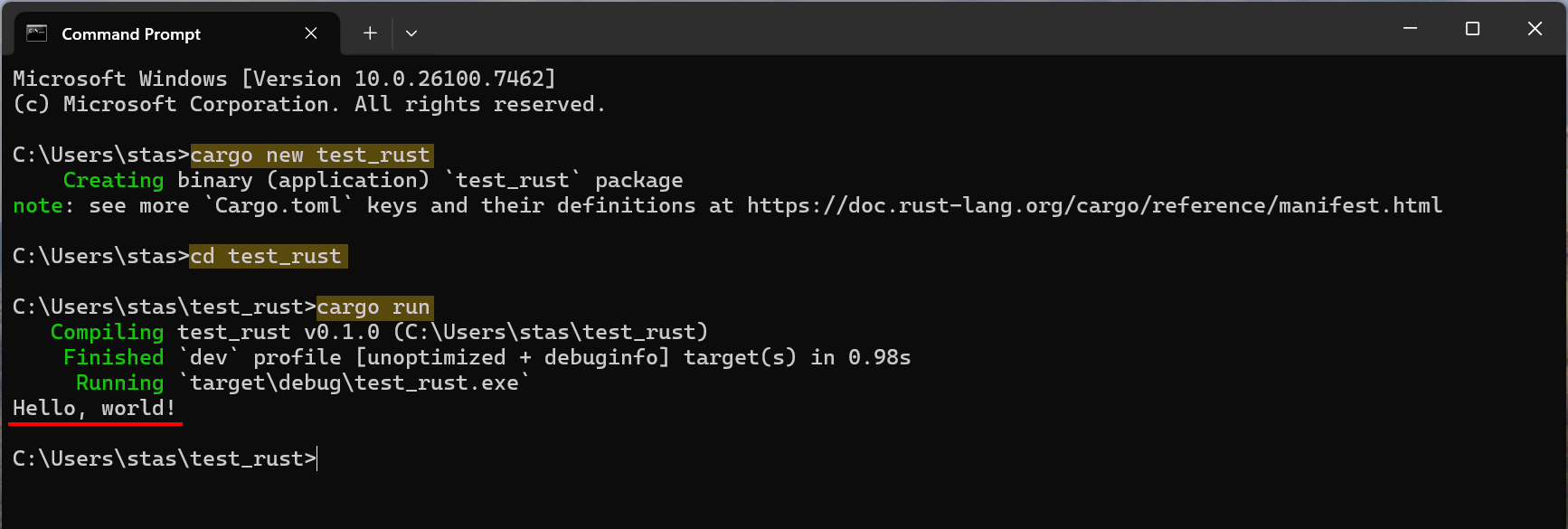 cargo new test_rust— создать новый Rust проект. С утилитой Cargo мы познакомимся потом, а пока что нам достаточно знать, что этой командой мы создадим “болванку” Rust программы, которая просто печатает на консоль строку “Hello, world!”cd test_rust— перейти в свежесозданный каталог test_rustcargo run— скомпилировать и запустить программу