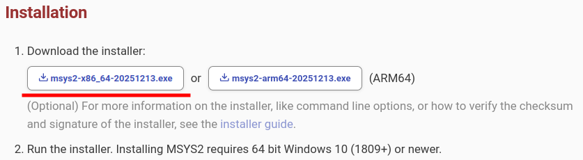 1) Сначала скачайте инсталлятор MSYS2: https://www.msys2.org/#installation