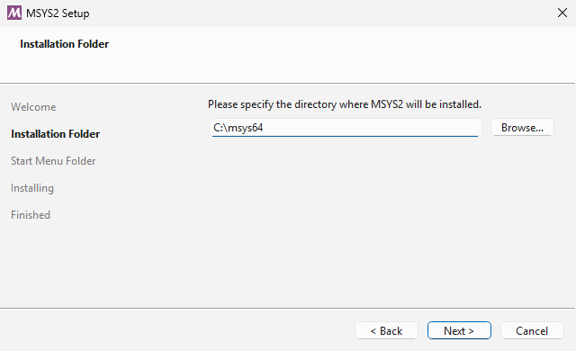 Запустите инсталлятор, и выберите путь по которому будет хранится как сам MSYS2, так и устанавливаемые им программы и библиотеки: