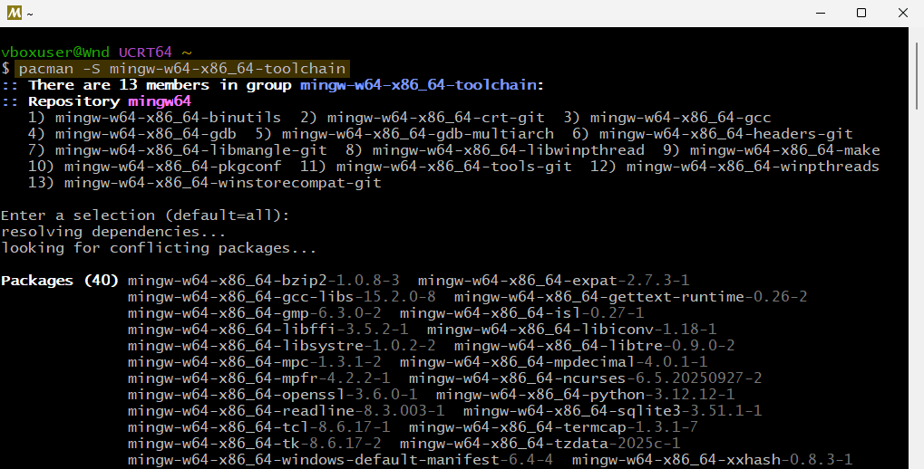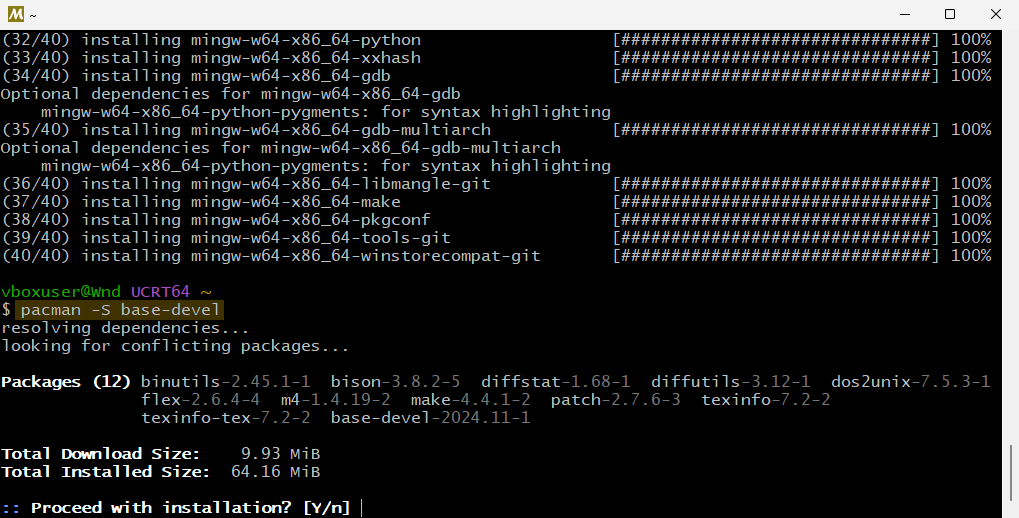 2) После завершения установки, откройте msys2 консоль (должна появится в меню “Пуск”) и установите пакеты mingw и base-develop при помощи команд: